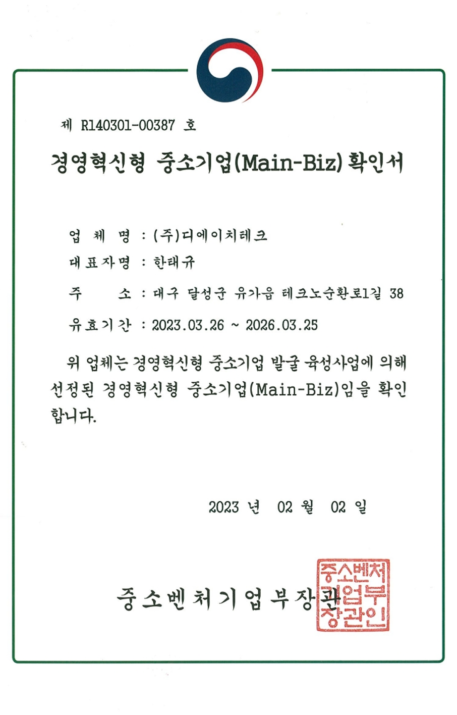 인증 경영혁신형 중소기업(Main-Biz)확인서